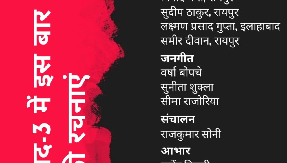 जसम के इस महत्वपूर्ण आयोजन में संस्कृतिकर्मी वर्षा बोपचे,सुनीता शुक्ला और सीमा राजोरिया द्वारा जनगीतों की प्रस्तुति दी जाएगी. कार्यक्रम का संचालन राजकुमार सोनी एवं आभार रूपेंद्र तिवारी द्वारा किया जाएगा.