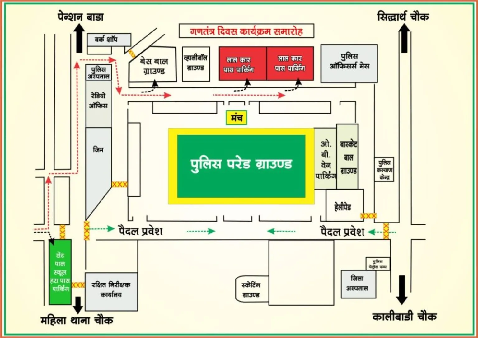 02. हरा कार पास धारी वाहन:- जिन आमंत्रित अतिथियों को पास हरा वाहन पास जारी हुआ है उनके वाहनों के लिए पार्किग व्यवस्था सेन्ट पॉल स्कूल के ग्राउण्ड में बनाई गई है। ये वाहन चालक कृप्या अपना वाहन को सेन्टपॉल स्कूल में पार्क कर पैदल पुलिस लाईन मुख्य द्वार से प्रवेश कर दर्शक दीर्घा तक जावेगे ।