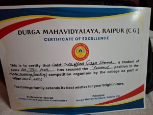 रायपुर। दुर्गा महाविद्यालय के वार्षिकोत्सव में कैडेट अंडर ऑफिसर गार्गी शर्मा को वर्ष 2024–25 में राष्ट्रीय कैडेट कोर (एनसीसी) वायु सेना की गतिविधियों में उल्लेखनीय योगदान के लिए सम्मानित किया गया। उन्होंने राष्ट्रीय गणतंत्र दिवस परेड 2025 में भाग लेकर महाविद्यालय को गौरवान्वित किया।