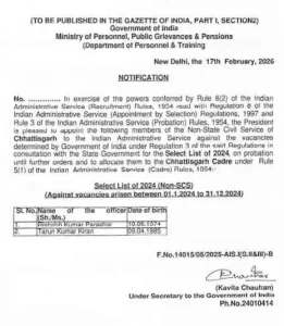 रायपुर। केंद्र सरकार के कार्मिक, लोक शिकायत एवं पेंशन मंत्रालय (कार्मिक एवं प्रशिक्षण विभाग) ने छत्तीसगढ़ के दो अलाइड सर्विस अधिकारियों को भारतीय प्रशासनिक सेवा (आईएएस) में नियुक्त किया है। यह नियुक्ति वर्ष 2024 की चयन सूची (नॉन-एससीएस) के अंतर्गत की गई है।