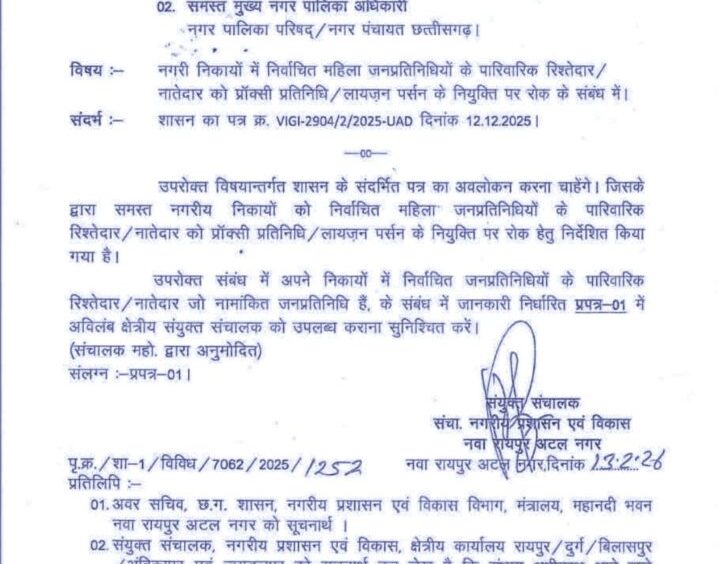 इस संबंध में संचालनालय नगरीय प्रशासन एवं विकास द्वारा क्र./शा-1/विविध/7062/2025/12541 दिनांक 3-2-26 को पुनः एक पत्र राज्य के समस्त आयुक्त नगर पालिक निगम व समस्त मुख्य नगर पालिका अधिकारी नगर पालिका परिषद्/नगर पंचायत को पत्र जारी करते हुवे कहा गया है कि नगरी निकायों में निर्वाचित महिला जनप्रतिनिधियों के पारिवारिक रिश्तेदार /नातेदार को प्रॉक्सी प्रतिनिधि/लायज़न पर्सन के नियुक्ति पर रोक के संबंध में शासन के पत्र क्र. VIGI-2904/2/2025-UAD दिनांक 12.12.2025 के तहत समस्त नगरीय निकायों को निर्वाचित महिला जनप्रतिनिधियों के पारिवारिक रिश्तेदार / नातेदार को प्रॉक्सी प्रतिनिधि/लायज़न पर्सन के नियुक्ति पर रोक हेतु निर्देशित किया गया है। उपरोक्त संबंध में अपने निकायों में निर्वाचित जनप्रतिनिधियों के पारिवारिक रिश्तेदार/नातेदार जो नामांकित जनप्रतिनिधि हैं, के संबंध में जानकारी निर्धारित प्रपत्र-01 में अविलंब क्षेत्रीय संयुक्त संचालक को उपलब्ध कराना सुनिश्चित किये जाने हेतु आदेशित किया गया है ।