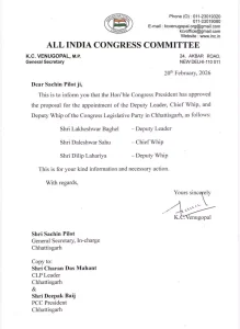 छत्तीसगढ़ कांग्रेस में अहम नियुक्तियां: लखेश्वर बघेल उप नेता प्रतिपक्ष, दलेश्वर साहू चीफ व्हिप, दिलीप लहरिया डिप्टी व्हिप