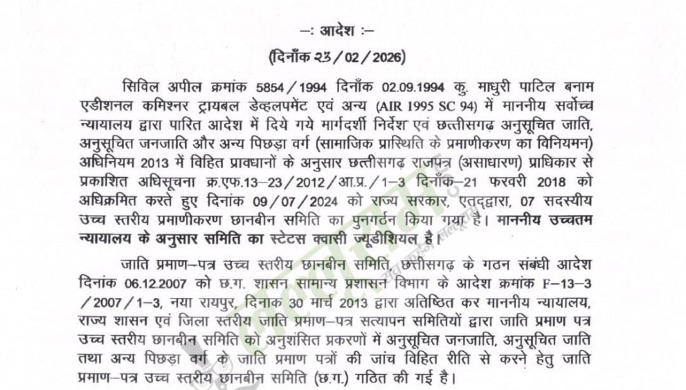 रायपुर। छत्तीसगढ़ में अनुसूचित जनजाति (एसटी) आरक्षण से जुड़ा एक महत्वपूर्ण मामला सामने आया है। राज्य की उच्च स्तरीय प्रमाणीकरण छानबीन समिति ने प्रधानमंत्री ग्राम सड़क योजना (PMGSY) के मुख्य अभियंता के.के. कटारे को छत्तीसगढ़ में अनुसूचित जनजाति का संवैधानिक आरक्षण पाने के लिए अयोग्य पाया है।