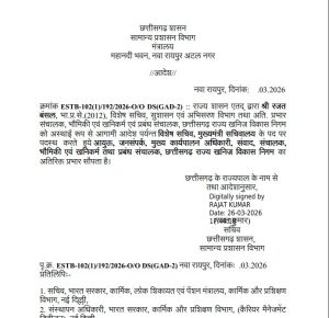 रायपुर। छत्तीसगढ़ सरकार ने प्रशासनिक फेरबदल करते हुए रजत बंसल को मुख्यमंत्री सचिवालय में विशेष सचिव पद पर तैनात किया है और उन्हें जनसंपर्क आयुक्त का अतिरिक्त प्रभार भी सौंपा है। वहीं, रवि मित्तल को प्रधानमंत्री कार्यालय (PMO), नई दिल्ली में उप सचिव के पद के लिए रिलीव कर दिया गया है।