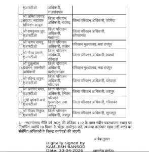 CG ट्रांसफर ब्रेकिंग: परिवहन विभाग में बड़ा फेरबदल, कई जिलों के अफसरों के तबादले