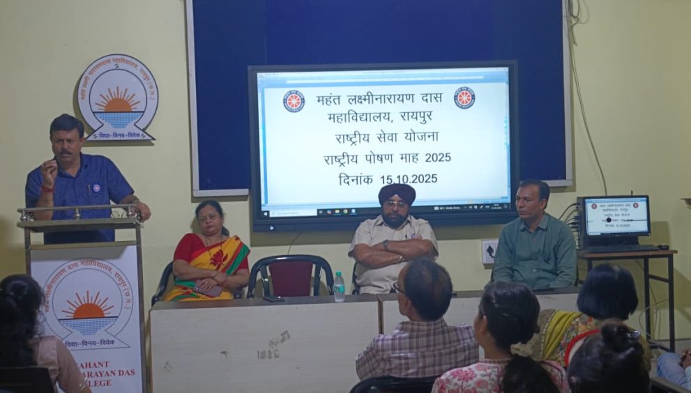 रायपुर। महंत लक्ष्मीनारायण दास महाविद्यालय में राष्ट्रीय सेवा योजना इकाई द्वारा 8वां राष्ट्रीय पोषण माह 2025 हर्षोल्लास के साथ महाविद्यालय के सेमिनार कक्ष में मनाया गया। इस अवसर पर आयोजित कार्यक्रम में मुख्य अतिथि के रूप में डॉ. एस.एस. खनुजा, पूर्व प्राचार्य, दुर्गा महाविद्यालय उपस्थित रहे। कार्यक्रम की अध्यक्षता महाविद्यालय के प्राचार्य डॉ. देवाशीष मुखर्जी ने की।