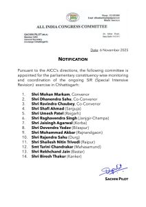 रायपुर।प्रदेश कांग्रेस प्रभारी सचिन पायलट ने AICC के निर्देश पर छत्तीसगढ़ में निगरानी समिति बनाई है, जो SIR अभियान की मॉनिटरिंग करेगी। कांग्रेस के पूर्व प्रदेश अध्यक्ष मोहन मरकाम को समिति के संयोजक बनाए गए हैं। वहीं धनेंद्र साहू और रविंद्र चौबे सह संयोजक बनाए गए हैं।