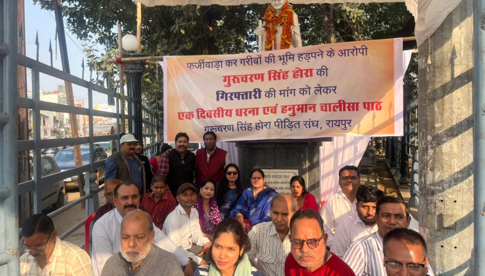 रायपुर। भू-माफिया गुरुचरणसिंह होरा व उसके रिश्तेदारों की गिरफ्तारी के लिए होरा पीड़ित संघ द्वारा कल गांधी प्रतिमा आजाद चौक में एक दिवसीय धरना दिया गया। होरा पीड़ित संघ ने हनुमान चालीसा पाठ का पाठ भी किया। कहा जा रहा है कि जनता के दबाव में अब पुलिस गुरुचरणसिंह को एक-दो दिन के भीतर गिरफ्तार कर सकती है। गुरुचरणसिंह की गिरफ्तारी के लिए आयोजित धरने में सत्येन्द्र सोनकर, देवनाथ देवनाथ देवांगन, शेखर साहू, सुरेश शर्मा, निथलेश धीवर, श्रीमती ज्योति तिवारी, हेमराज अग्रवाल, श्रीमती लीना देवांगन, श्रीमती पुष्पा साहू, भास्कर शर्मा, सुनील देवांगन, विवेक शर्मा, श्रीमती करूणा शर्मा, अक्षत देवांगन, प्रांजली शर्मा, अक्षत तिवारी के अलावा होरा पीड़ित संघ के अन्य सदस्य उपस्थित थे। धरने को प्रदेश कांग्रेस कमेटी के महामंत्री कन्हैया अग्रवाल, भाजपा नेता हरिवल्लभ अग्रवाल, ओमकार धनगर, विरेंद्र पांडेय, हिमांशु तिवारी,विवेक तनवानी , राजेश केडिया एवं अन्य ने समर्थन किया।