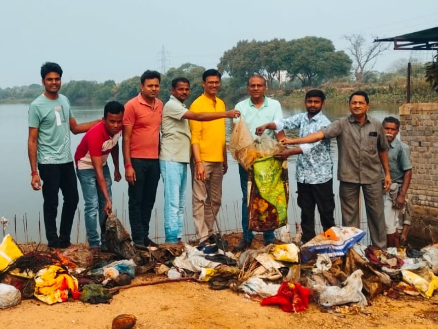 महाशिवरात्रि के अवसर पर मंदिर किनारे तालाब की सफाई की गई