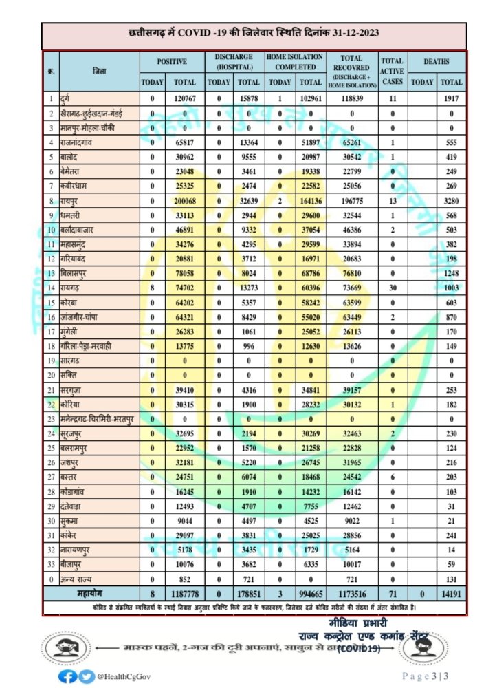 रायपुर। छत्तीसगढ़ में कोरोना मरीजों की संख्या 71 हो गई गई। स्वास्थ्य विभाग ने कल 31 दिसंबर को 1160 सैंपल की जांच की थी। इनमें से 8 केवल एक ही जिले रायगढ़ से मिले। इन्हें मिलाकर कुल 71 सक्रिय मरीज हो गए हैं। स्वास्थ्य विभाग ने कल अपने बुलेटिन में बताया कि छत्तीसगढ़ में 1160 सैम्पलों की जांच हुई। प्रदेश की औसत पॉजिटिविटी दर 0.69 प्रतिशत है। प्रदेश के 1 जिले से कोरोना संक्रमित पाए गए तथा शेष जिलों में आज कोरोना का कोई नया मामला नहीं आया।