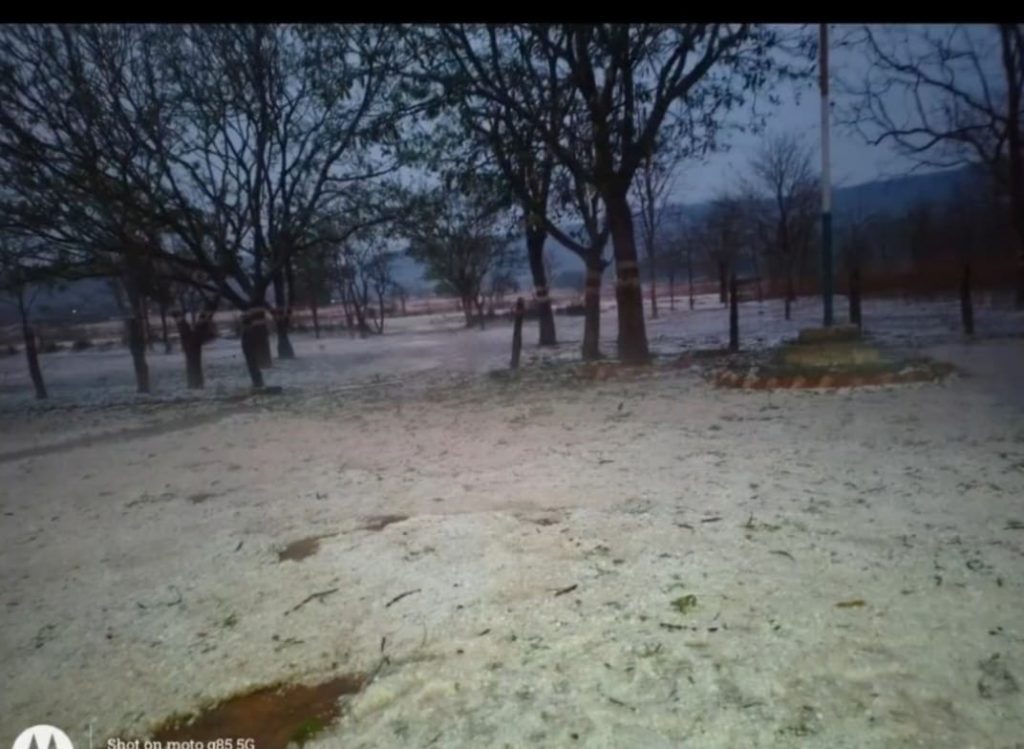 मैनपुर के आमामोरा-ओड़ में ओलावृष्टि से बिछी बर्फ की चादर,