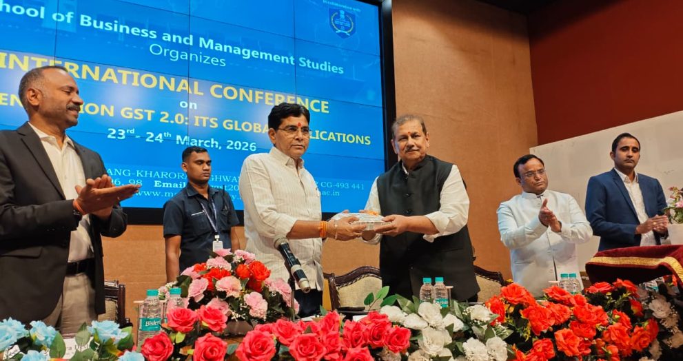 रायपुर। मैट्स विश्वविद्यालय के स्कूल ऑफ बिजनेस एंड मैनेजमेंट स्टडीज़ द्वारा 23–24 मार्च 2026 को “नेक्स्ट जेनरेशन GST 2.0: इसके वैश्विक प्रभाव” विषय पर द्विदिवसीय अंतरराष्ट्रीय सम्मेलन का भव्य आयोजन किया गया। यह कार्यक्रम सिविल लाइंस स्थित न्यू कन्वेंशन हॉल एवं सर्किट हाउस में गरिमामयी वातावरण में संपन्न हुआ। सम्मेलन में देश-विदेश के विद्वानों, शोधकर्ताओं और शिक्षाविदों ने भाग लेकर आधुनिक कर प्रणाली, वैश्विक आर्थिक प्रभावों और नीतिगत दृष्टिकोणों पर गहन चर्चा की। कार्यक्रम की शुरुआत सरस्वती वंदना एवं राष्ट्रगान के साथ हुई। संयोजक डॉ. उमेश गुप्ता ने स्वागत उद्बोधन देते हुए सम्मेलन की रूपरेखा प्रस्तुत की। इस अवसर पर कुलाधिपति गजराज पगारिया, कुलपति प्रो. (डॉ.) के.पी. यादव, डायरेक्टर जनरल […]