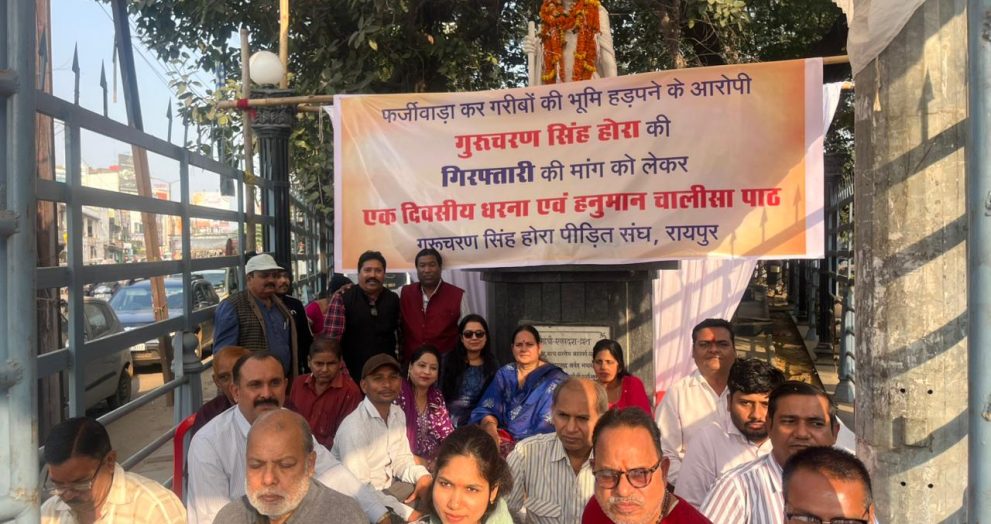 रायपुर। भू-माफिया गुरुचरणसिंह होरा व उसके रिश्तेदारों की गिरफ्तारी के लिए होरा पीड़ित संघ द्वारा कल गांधी प्रतिमा आजाद चौक में एक दिवसीय धरना दिया गया। होरा पीड़ित संघ ने हनुमान चालीसा पाठ का पाठ भी किया। कहा जा रहा है कि जनता के दबाव में अब पुलिस गुरुचरणसिंह को एक-दो दिन के भीतर गिरफ्तार कर सकती है। गुरुचरणसिंह की गिरफ्तारी के लिए आयोजित धरने में सत्येन्द्र सोनकर, देवनाथ देवनाथ देवांगन, शेखर साहू, सुरेश शर्मा, निथलेश धीवर, श्रीमती ज्योति तिवारी, हेमराज अग्रवाल, श्रीमती लीना देवांगन, श्रीमती पुष्पा साहू, भास्कर शर्मा, सुनील देवांगन, विवेक शर्मा, श्रीमती करूणा शर्मा, अक्षत देवांगन, प्रांजली शर्मा, अक्षत तिवारी के अलावा होरा पीड़ित संघ के अन्य […]