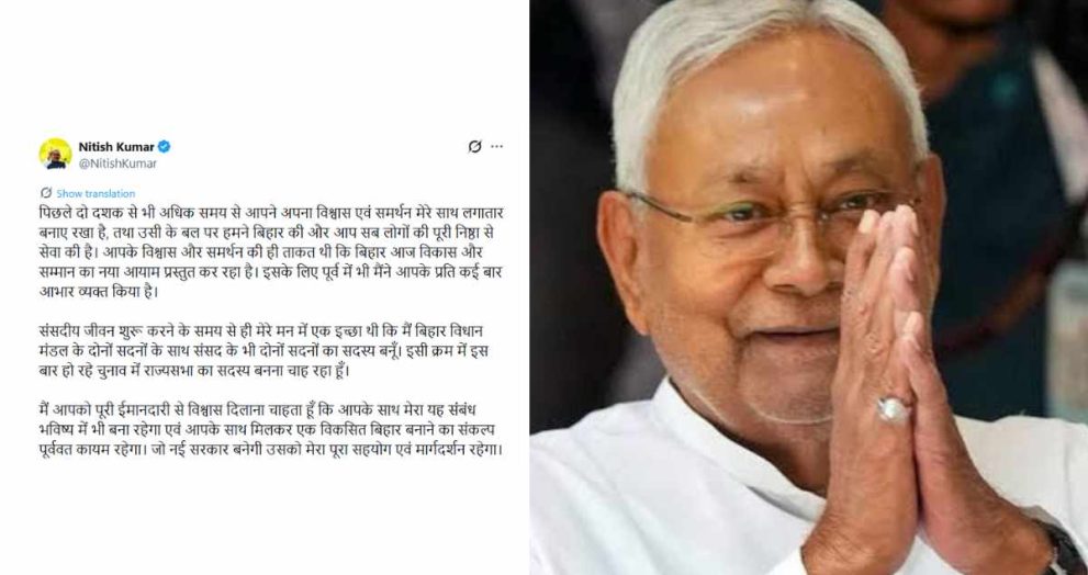 पटना। Nitish Kumar ने बिहार की राजनीति को लेकर बड़ा संकेत दिया है। उन्होंने सोशल मीडिया प्लेटफॉर्म X (Twitter) पर पोस्ट कर साफ कर दिया कि वे इस बार Rajya Sabha के चुनाव में जाना चाहते हैं। उनके इस बयान के बाद Bihar में नई सरकार बनने की चर्चा तेज हो गई है। नीतीश कुमार ने अपने संदेश में कहा कि पिछले दो दशकों से अधिक समय से बिहार की जनता ने उन पर भरोसा जताया है और उसी विश्वास के बल पर उन्होंने राज्य की सेवा की है। उन्होंने कहा कि जनता के सहयोग से बिहार आज विकास और सम्मान के नए मुकाम पर पहुंचा है। उन्होंने यह भी […]