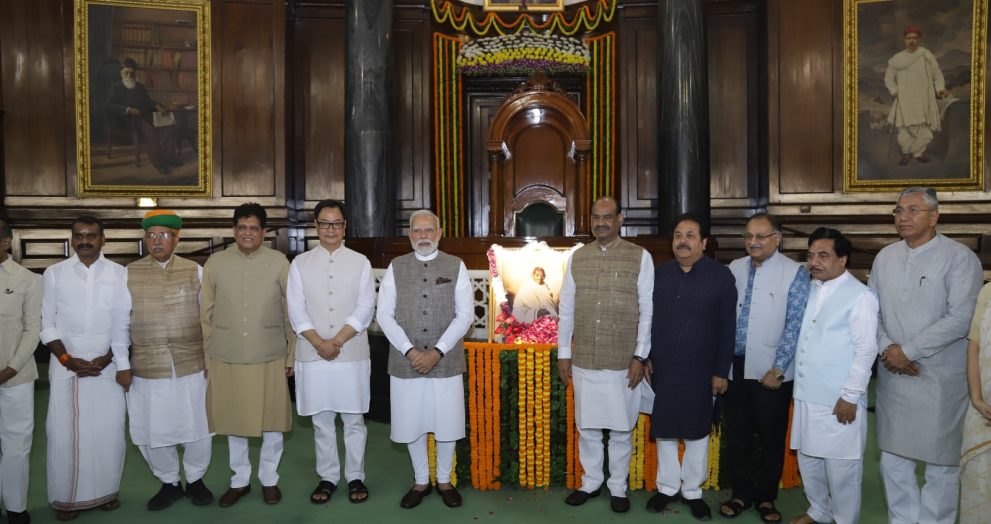 संसद भवन में गांधी जयंती पर पीएम मोदी ने उन्हें पुष्पांजलि अर्पित की